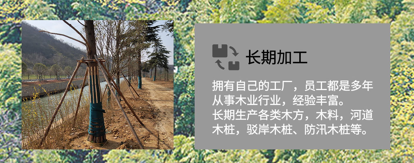 南京市云森木業(yè)有限公司位于南京市高淳區(qū)。是一家生產(chǎn)加工,線上銷售為一體的現(xiàn)代化企業(yè)。擁有完善、科學(xué)的質(zhì)量管理體系及工作團(tuán)隊(duì)。 公司主營松木樁,杉木樁,打樁木,河道木樁,駁岸木樁,防汛木樁,景觀木樁、園林綠化支撐桿等,也可支持方料,木板等木材定制加工產(chǎn)品,所選原材料均為黃山中心林區(qū),樹齡均在三十年左右。質(zhì)地緊密,樹形優(yōu)美。 本公司貨源充足,供貨能力強(qiáng),地處高淳,交通方便利,江浙滬皖送貨上門,當(dāng)天可達(dá)。本著“誠信為本,客戶至上”的經(jīng)營宗旨,真誠希望與您合作。 歡迎各位客戶前來咨詢,定以優(yōu)良品質(zhì)和價(jià)格回饋廣大客戶。